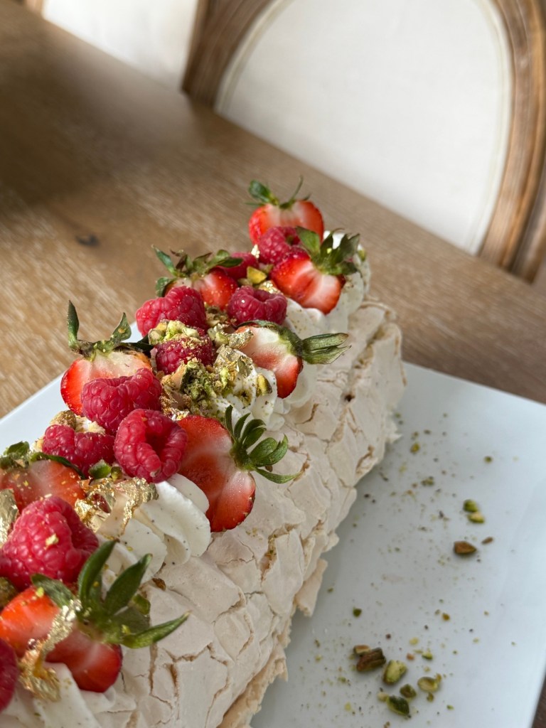 - Roll the meringue roulade into a tight roll. Decorate the top with piped cream, and your berries, and gold flakes! Enjoy!